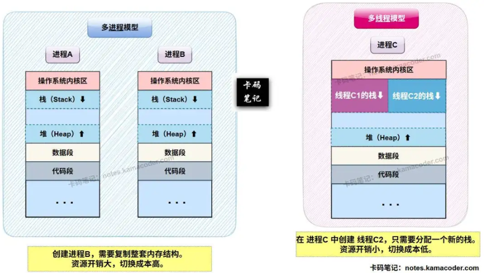 - 多进程模型和多线程模型的内存布局