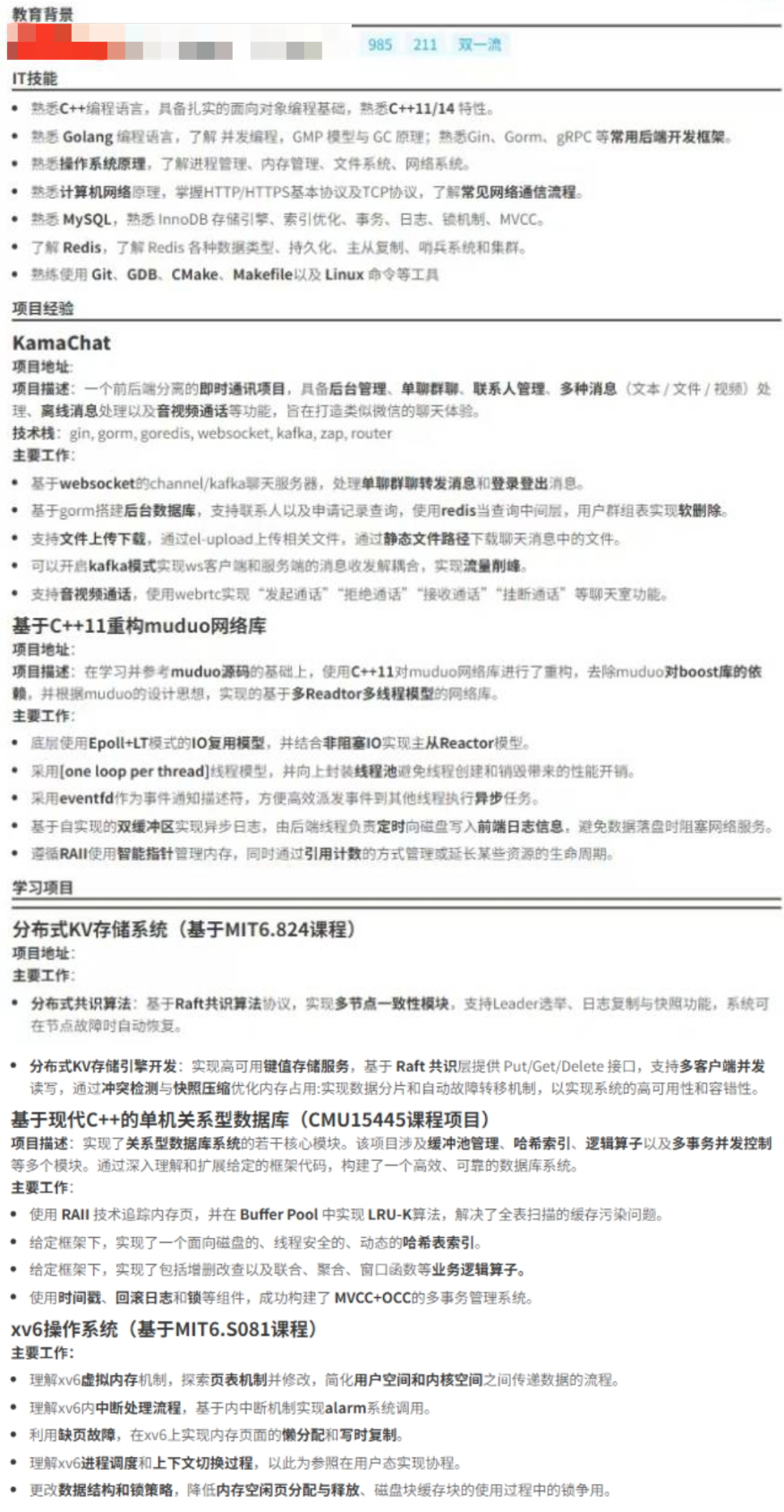 然后假期和大二下又做了CMU15445数据库和MIT6824分布式共识算法的公开课,而且平常也会看一些计算机专业的书籍沉淀技术,自认为计算机基础比较牢固。