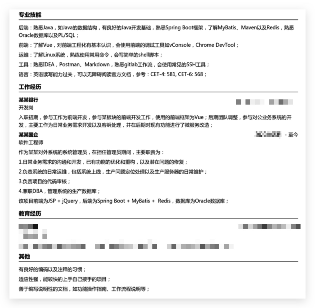 国企工作三年啥水平,来看看这位录友的简历,以下是他在知识星球 (opens new window)里的提问: