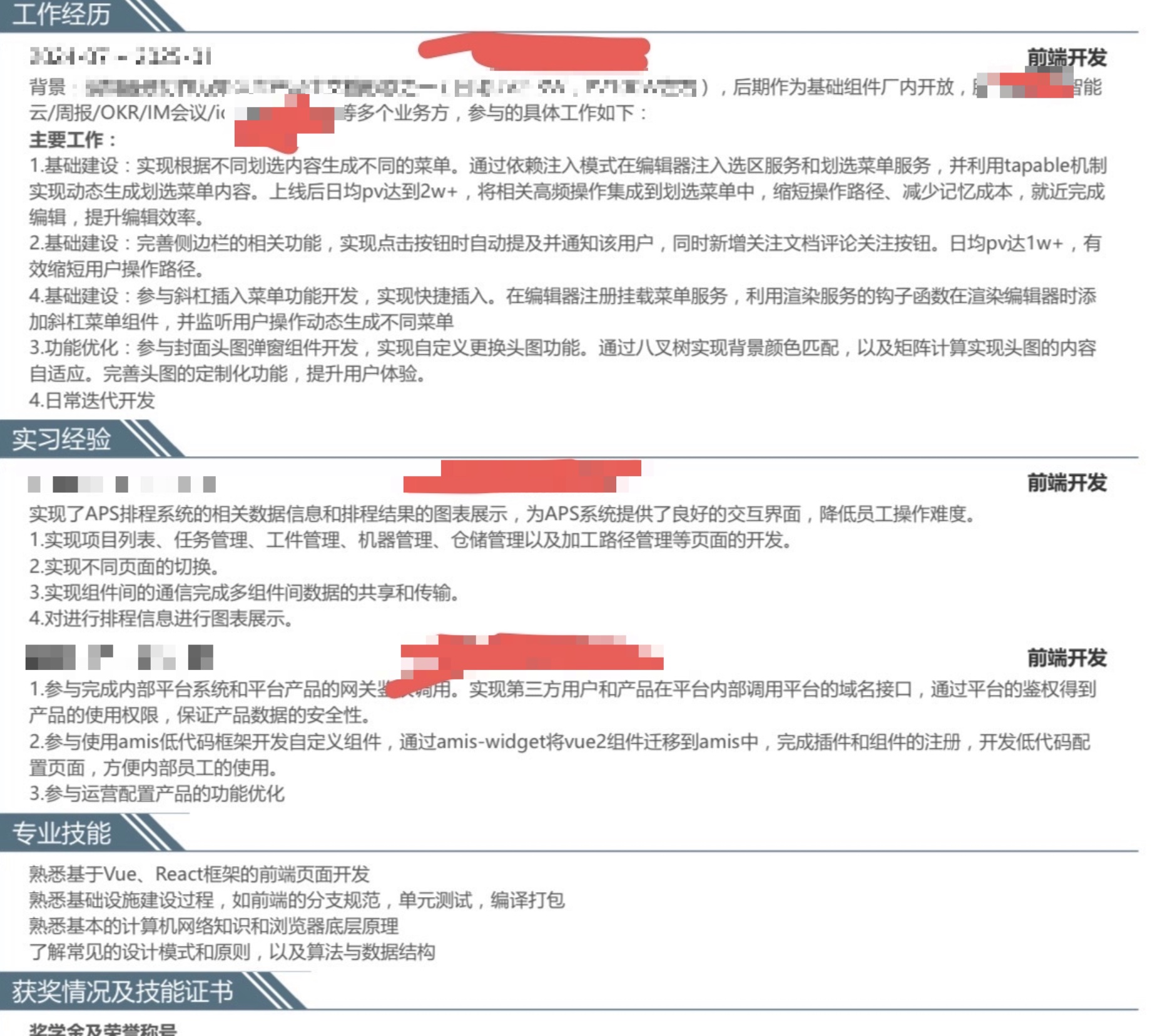 # 前端社招简历点评:大厂工作半年项目缺难点和收获
