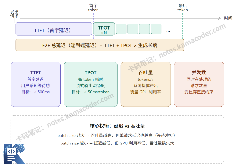 系统同时在处理的请求数量。并发数受显存约束——每个请求都需要分配 KV Cache,显存满了就没法接受新请求。压测时需要找到系统在不降低 SLA(服务等级协议)前提下能支撑的最大并发数。
