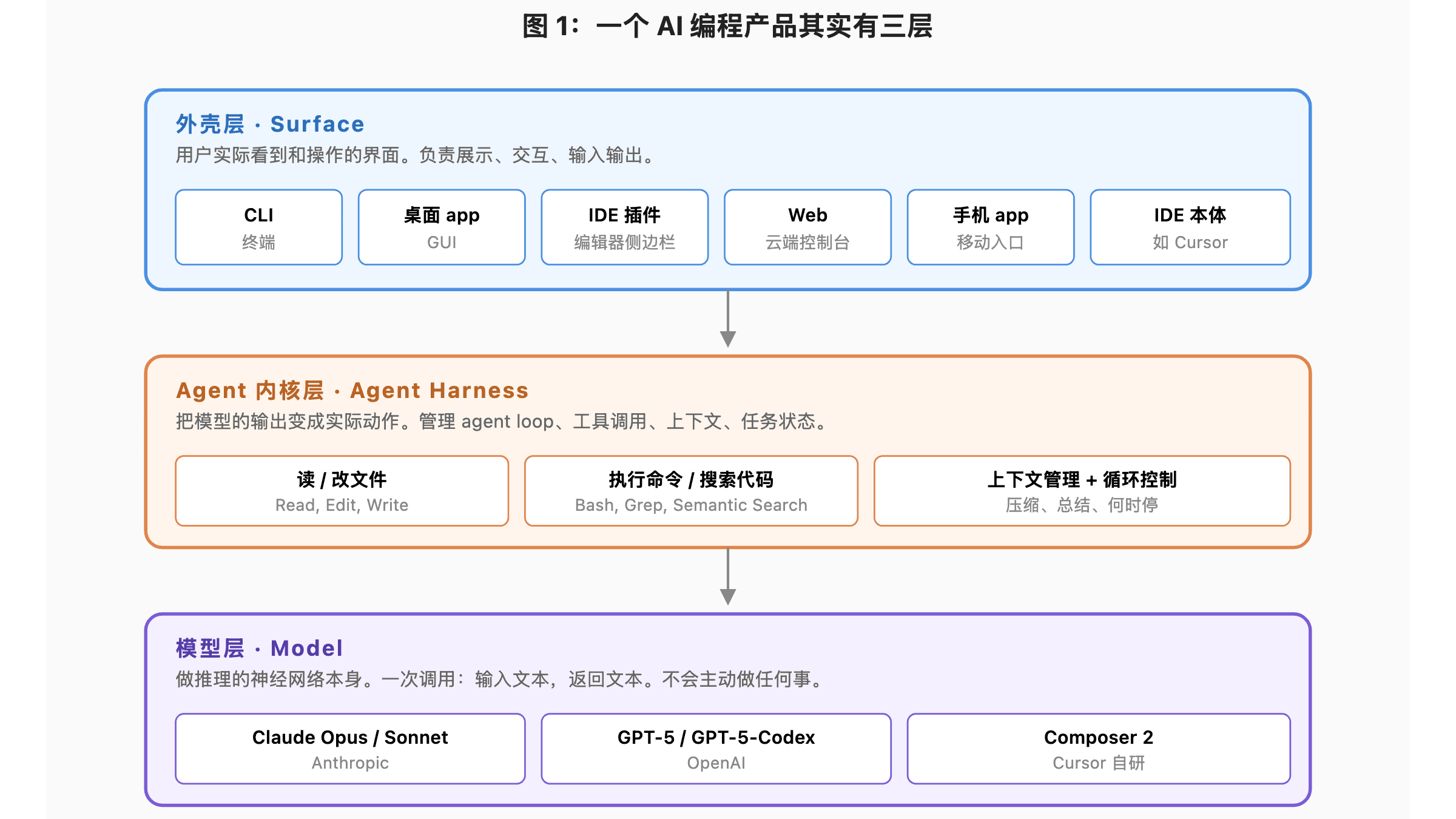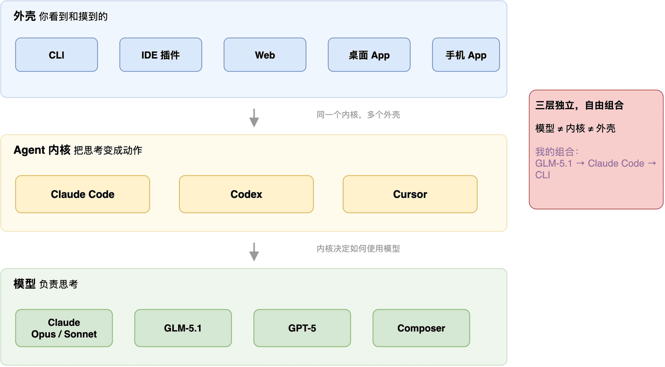 Claude Code 有自己的 agent 内核,Codex 有自己的,Cursor 有自己的。这些内核设计上的差异,很多时候比模型本身的差异更影响体验。