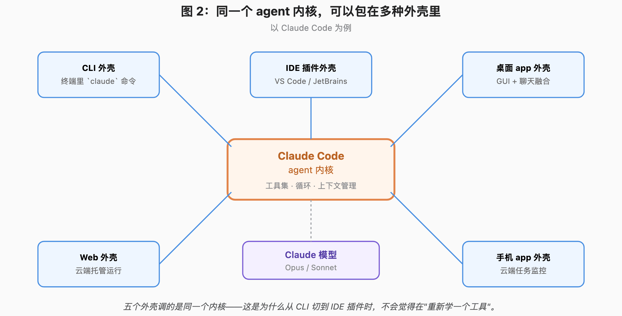 更有意思的是反过来。同一个 agent 内核,可以在多种外壳里跑。 Claude Code 的内核在 CLI、VS Code 插件、JetBrains 插件、桌面 app、网页云端、手机 app 里都是同一套,只是外面包的交互不同。所以你从 CLI 切到 IDE 插件时不会觉得在"重新学一个工具"——它们本来就是一个工具。