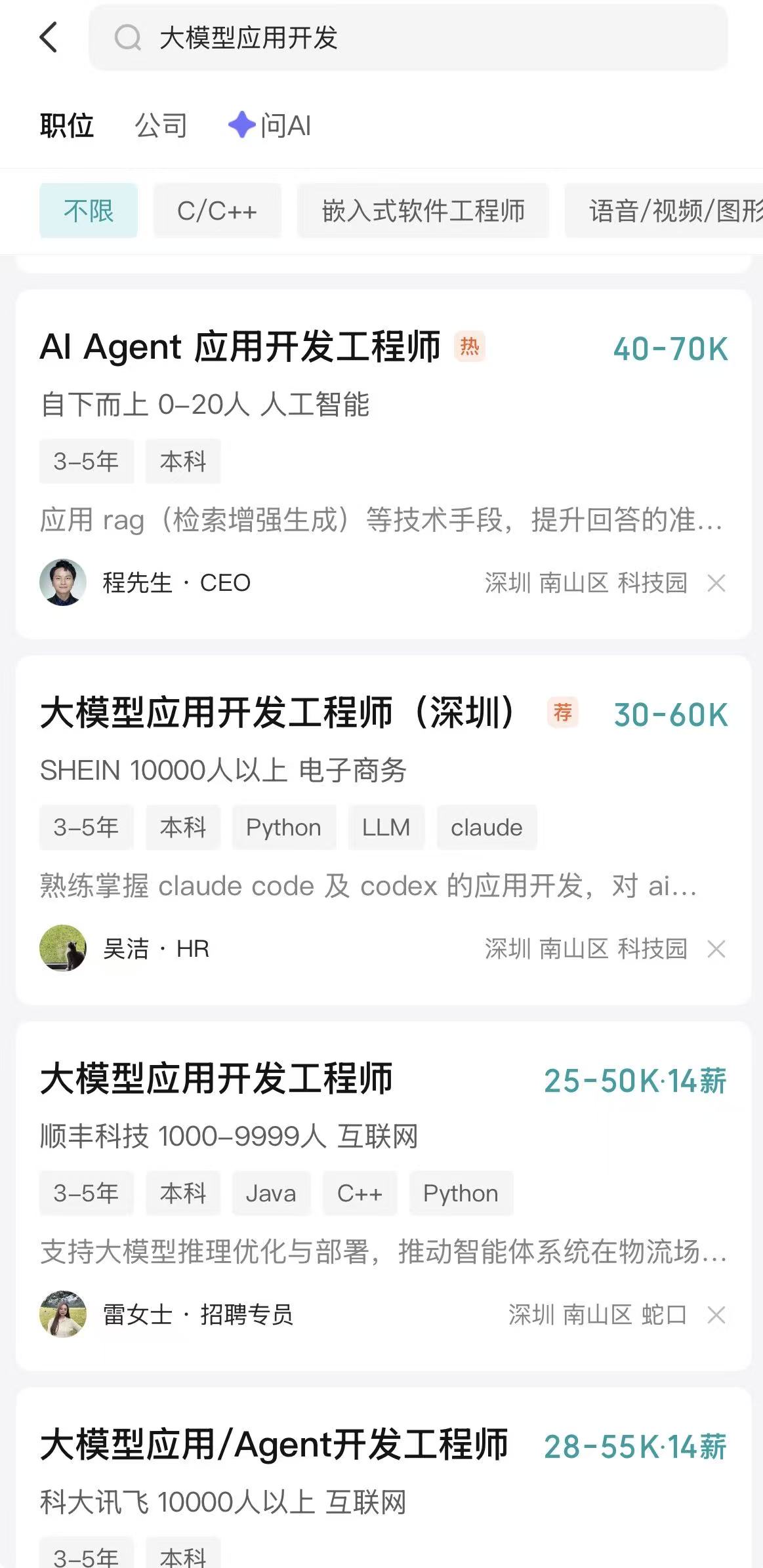 在boss上搜一下,现在 大模型应用开发 岗位很多,比普通开发岗位都多。下面我这还是仅仅深圳南山的结果: