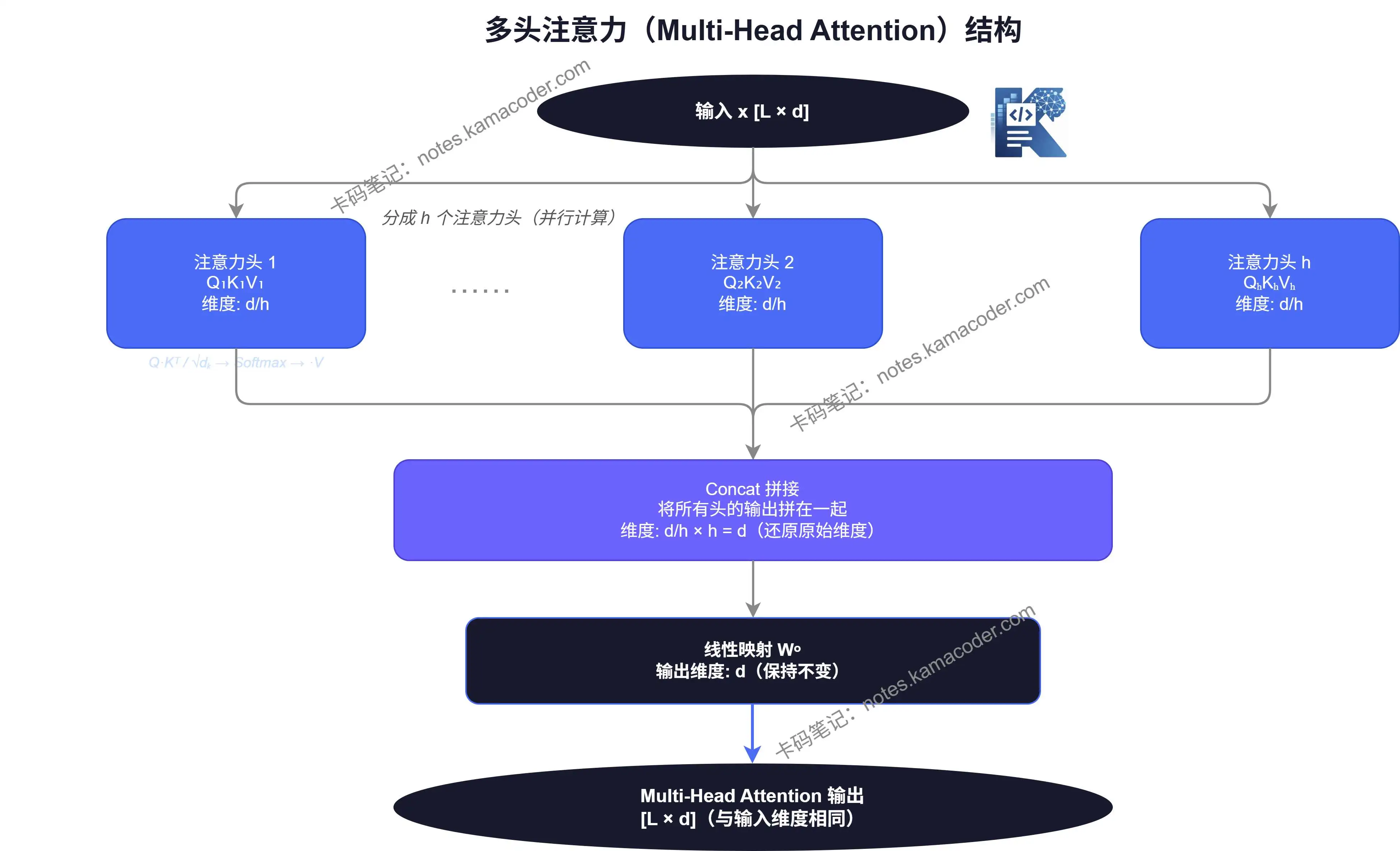 假设有 8 个注意力头,每个头负责不同的语义维度,最后把 8 个结果拼在一起,再做一次线性映射,输出和输入维度保持一致。